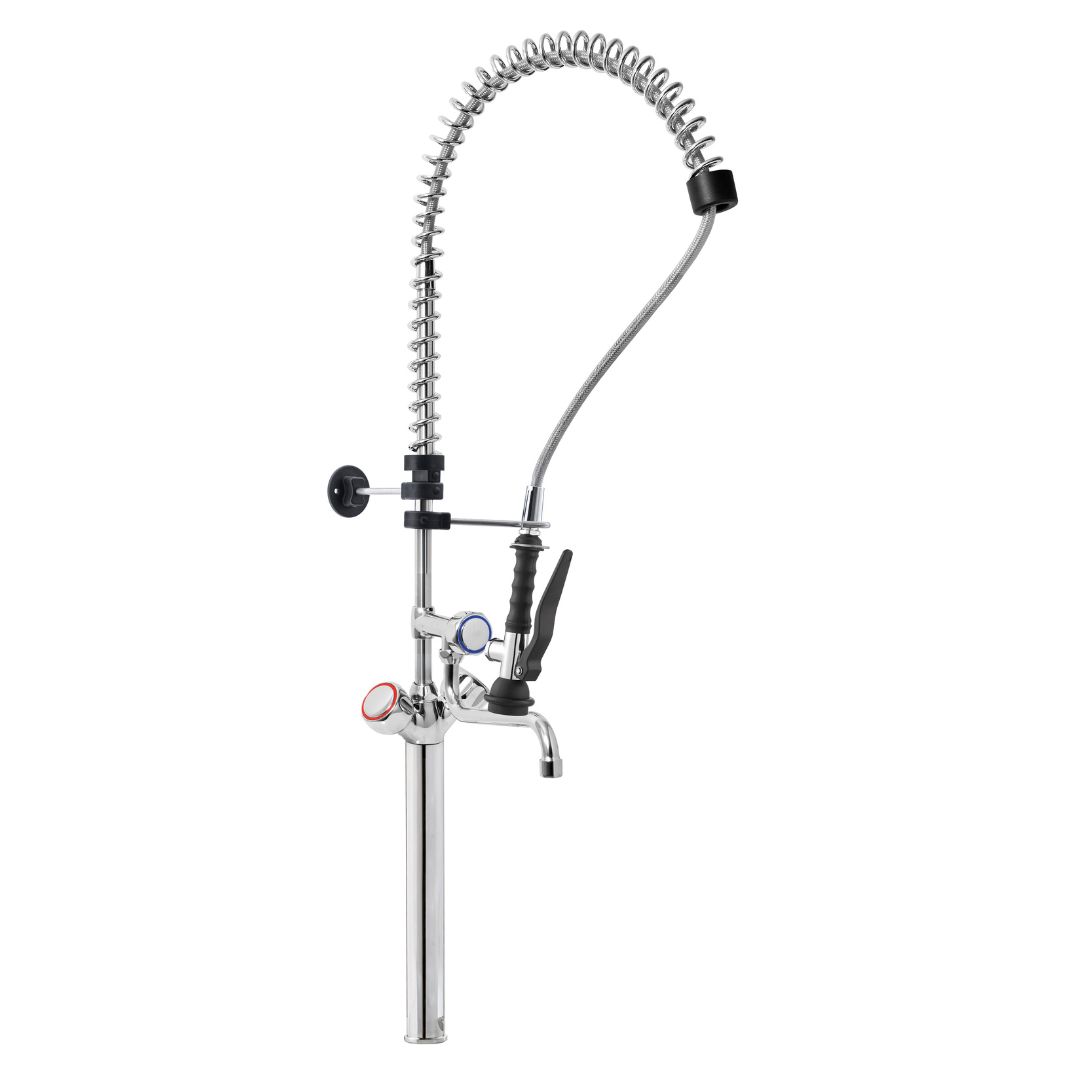 Gruppo doccia prelavaggio monoforo Monolith EXT0111R con prolunga, canna a metà asta, maniglie rotonde e doccetta Basic. Efficienza e affidabilità per uso professionale.